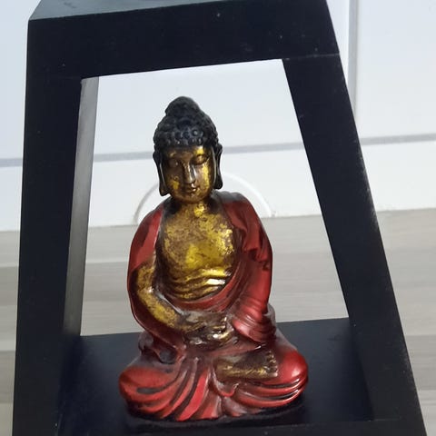Buddah te lysestake hvor det kan ha aromaolje i vann i glassbeholderen over telyset ca H 11 D 12 cm 390 g løs glassbolle på toppen
