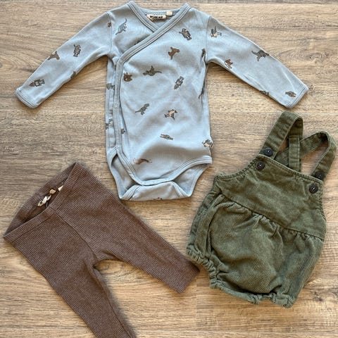Lite og pent brukt superfint sett fra Lil Atelier str. 68 🐻 Body og bukse med stramming i livet. Fremstår som nytt. Mykt og deilig. Dyre- og røykfritt hjem. Ingen flekker eller hull. Vasket med blenda sensitiv.