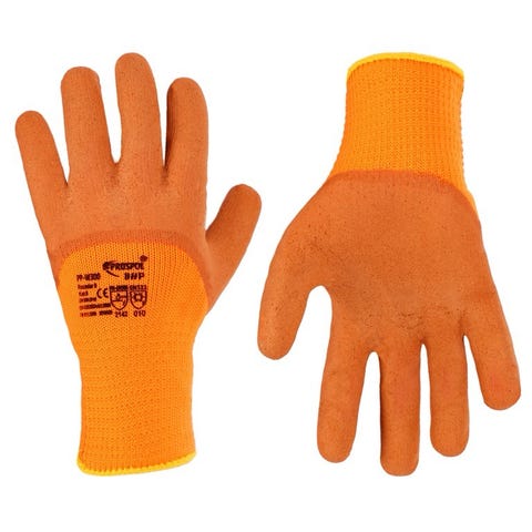 Arbeidshansker, beskyttende, strikkede, polyester, isolerte, i oransje farge, belagt med svart grov naturlatex på grepsdelen.