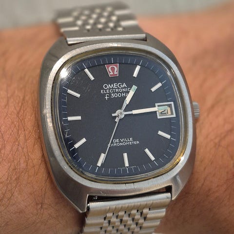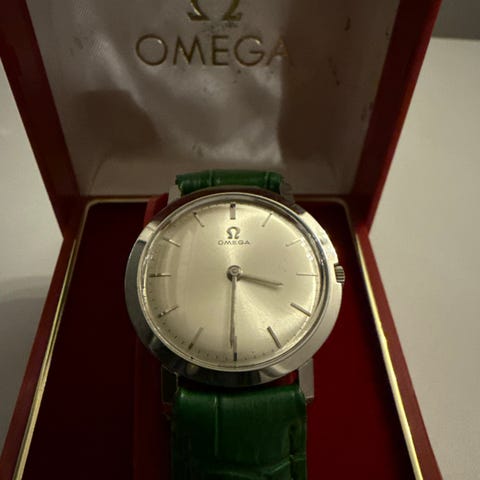 Pent brukt vintage dress klokke fra Omega. Nydelig patina på champagne/linfarget urskive. Skifter karakter i lyset. Få hairlines. Ukjent servicehistorikk. Klokken holder tiden og trekker lett. Klokken kommer på slitt original omega skinnreim med original Omega spenne og har original krone. Antar klokken er fra omkring 1975.
