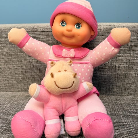 Vintage/Retro: Gullende rent Russ baby troll med stoff-kropp. Ca. 28 cm langt.