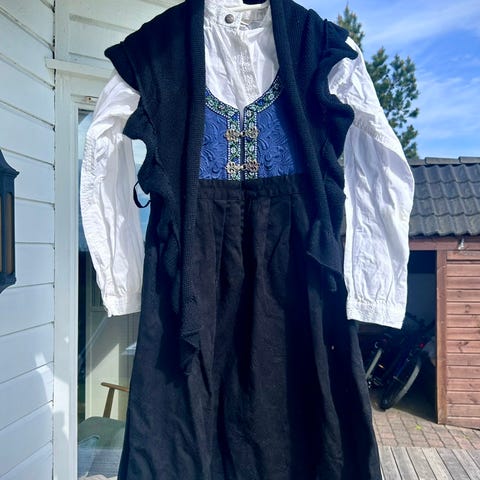 Selger brukt bunad til jente str 128. Ull og broderi, god kvalitet ikke hull.