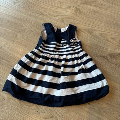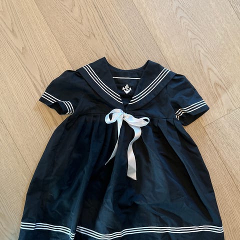 Flott marine seilerkjole av gammel modell. En klassiker! Flott krage. Påsydd sløyfe med fløyte.