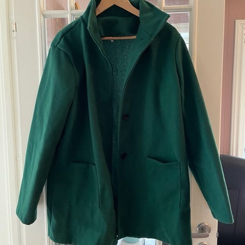 Lett, beige kåpe ( lang jakke) str. L ( 42-44 ), glidelås og trykknapper, to utvendige lommer og en innerlomme. Kåpen er ikke fylt med dun, denne kan vaskes på 30 grader.