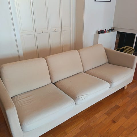 Fin sofa som fortsatt har hold i putene. Ingen synlige flekker, men kan kanskje ha godt av en rens. Ca 7-10 år gammel.