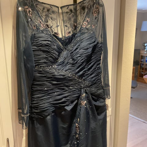 Antatt ca str 44. Kjolen er i fin blålilla farge. Bilde 1 viser kjolens farge best. Sjal følger med.