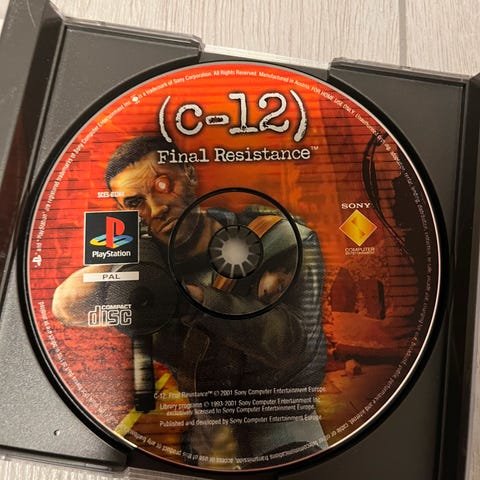 C-12 Final Resistance til Playstation 1. Komplett med manual. Cover har noen skader. Testet til oppstartsmenyen. Disken har noen overflateriper, ellers fin.
