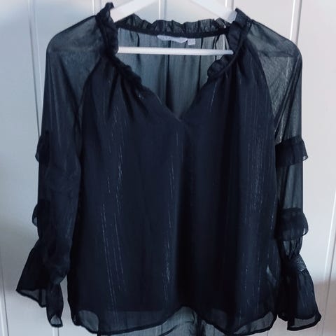 Mørkeblå, glitrende bluse i merke Va vite (kjøpt hos Match). Står størrelse 34, men er stor i størrelsen.