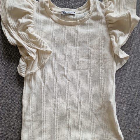 Ermeløs ribbetopp i stretchy kvalitet. Rund hals, figurnær passform og volanger på skuldrene. Kan brukes på to forskjellige måter. Toppen inneholder det naturlige materialet rayon, som gjør at plagget puster, og er behagelig og avkjølende å ha på seg.