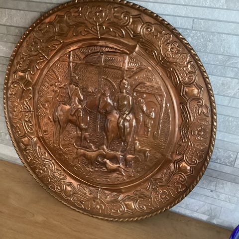 Selger et pent retro vegg fat i kobber med et klassisk skute motiv for kr 200,-