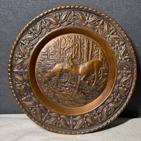 Selger et stort flott retro vegg fat i kobber med det klassiske elg motivet for kr 300,- Fatet har en diameter på 36,5 cm og det er i pen stand . Fatet selges som vist på bildene og det kan hentes hjemme hos meg i Oslo eller så kan det sendes .