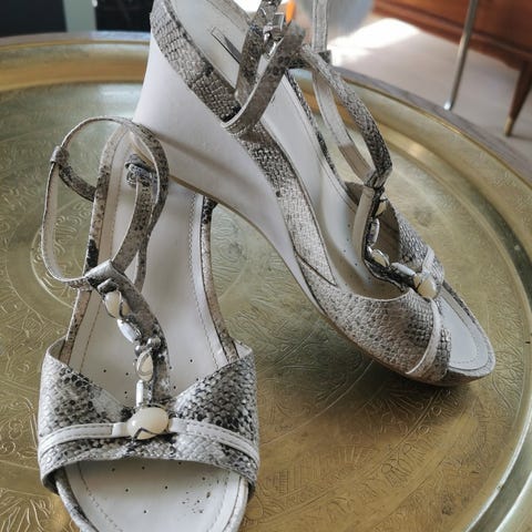 Selskapssko med ankelreim fra Orient Express. Str.39. Skinnet har trykk av grå/hvit/beige/sølv/gull mønster. Hælene (5 cm høye) har fått ny såle. Har litt slitasje i skinnet, men er kjempeflotte på foten. Kan sendes. Kr.200