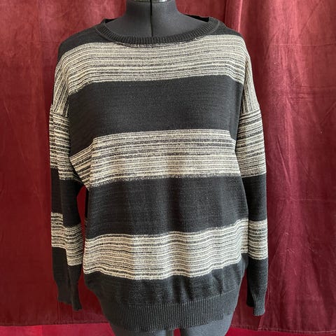 Sort genser med glittertråder og overlapping bak fra Caddis Fly. Størrelse M-omkrets bryst er 112 cm, livvidde 106 cm og lengde 65 cm (målt fra nakken). Laget av en blanding av bomull og polyester. Pent brukt uten flekker eller skader.