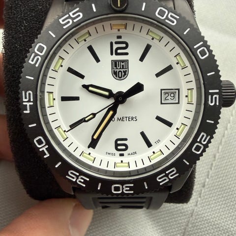 Urskive: Sort med selvlysende markerer indeksmarkeringer, selvlysende visere
