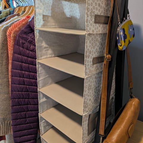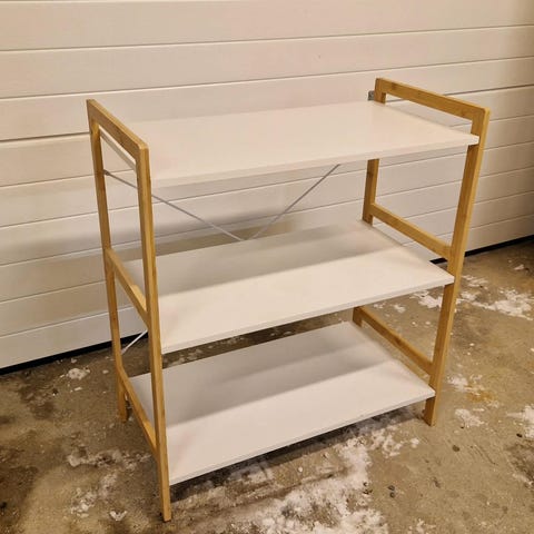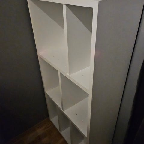 Hylle med 3x2 knagger. Hyllen har også stang til å henge kleshengere i. Perfekt til bruk i gang eller garderobe.