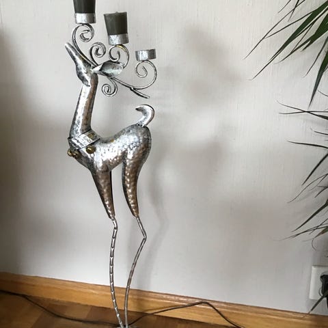 2 stk fine og dekorative lysestaker av reinsdyr/hjort. Bjellene lager lyd ved berøring. Ingen skader og fremstår som nye.