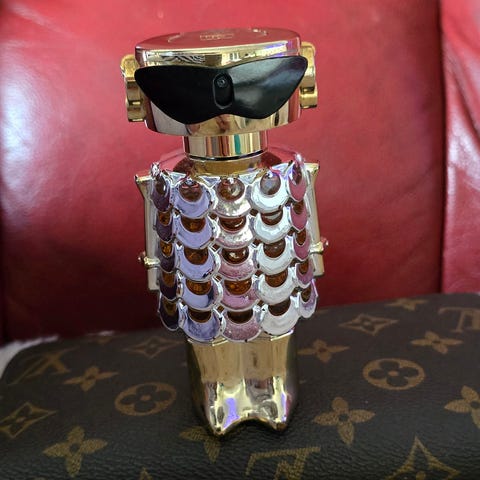 Rabanne parfymeflaske med en kapasitet på 30 ml. Flasken er laget av klart glass med et dekorativt mønster og har en gullfarget hette. Passer for kvinner.