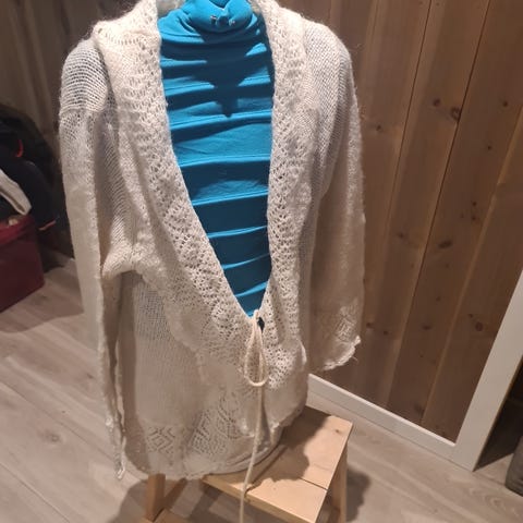 Nydelig strikket vintage jakke, lys beige med gulltråder, 1 knapp øverst. Lekker til utenpå kjoler på svale sommerkvelder og sikkert unik. Str S/M Selges kr 200,-(46)