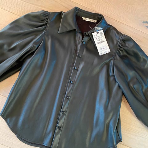 Bluse i svart farge, størrelse M. Blusen har lange ermer med knappdetaljer på mansjettene og er laget i et lett, gjennomsiktig materiale. Passer til kvinner.Tøff til skinnbukse .Eller selskap