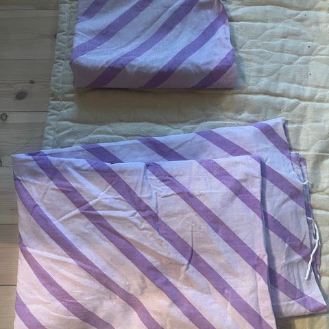 Rosa flanell dynetrekk og putevar med motiv i grått og oker