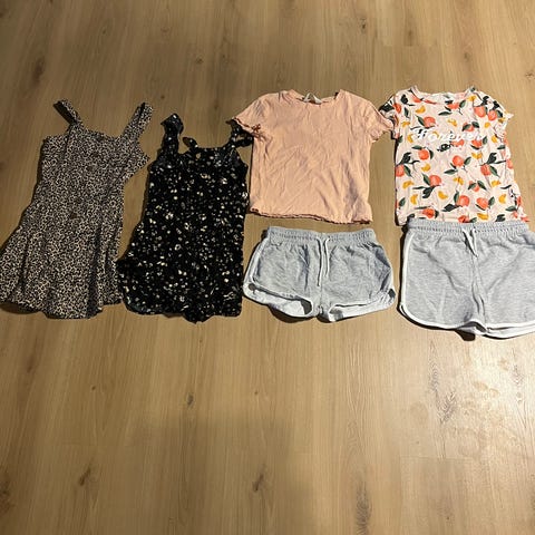 1 shorts, 1 jumpsuit, 1 skjørt og en topp, pent brukt.