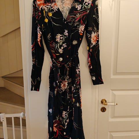 Søt svart kjole med knyting og blomstermønster . Merk: ikke omslagskjole. Nesten ikke brukt - fremstår som ny. Rekker til midt på leggen