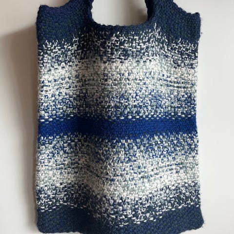 Heklet nett i drops karisma (bomullsgarn) i fargene blå og hvit . Lengde fra bunn til topp håndtak er ca 60 cm og ca 36 cm bredt.