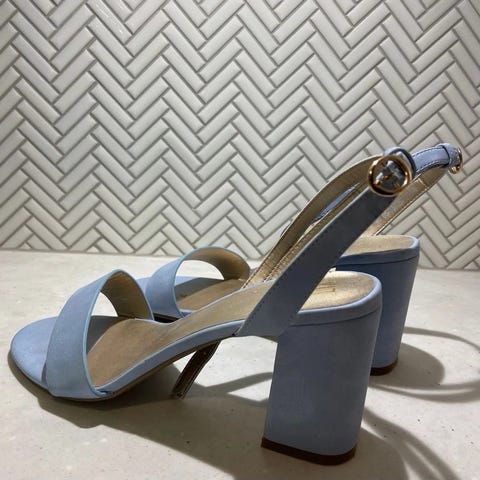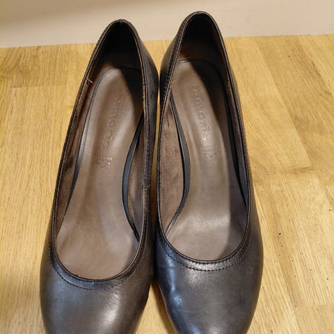 Hælhøyde 8 cm. Softwalk og stødige. Meget god på foten. Normal i størrelsen. Skinn.