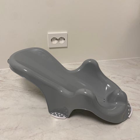 Badestøtte til baby, kan brukes i badebalje/badekar/eller for å enklere dusje babyen. Står støtt også på flis. Fremstår som ny, farge mørkegrønn. Kjøpt på barnas hus til en mye høyere pris.