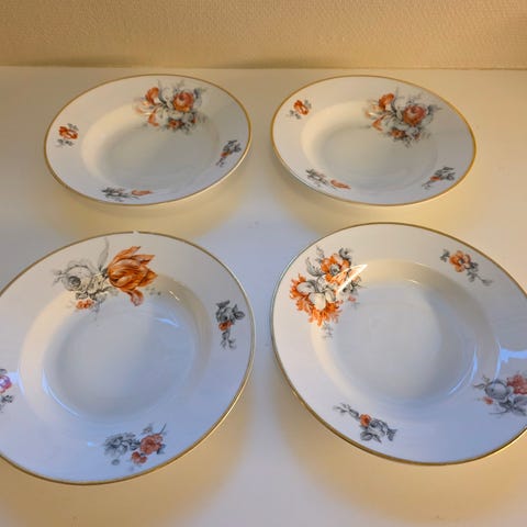 Desserttallerkener med nydelig blomstermønster. De er hele og uten skader, men er dessverre litt slitt på gullkantene i varierende grad. Lite bruksspor ellers, blanke og fine i glasuren. De er stemplet 63 under, så de er jo noen år.