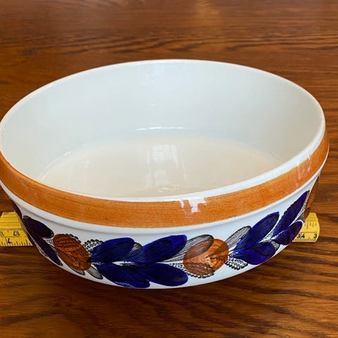 Pen bolle fra Rørstrand - Modell Cypress. Fra 60-tallet. Høyde 7 cm, diameter ca 22 cm. Noen små, aldersrelaterte flekker (avbildet), men hel og i god stand.