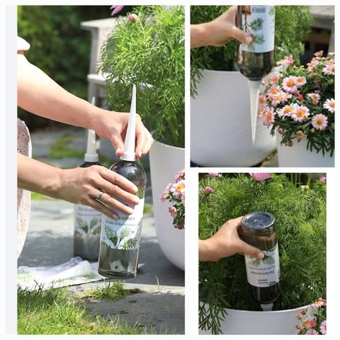 Slik bruker du den: Fyll plastflasken med vann, skru ferievanneren på flasken og setter den på hodet oppi blomsterpotta. Da trekker den ut så mye vann som den trenger selv, og du kan komme hjem til en fortsatt blomstrende og fin uteplass.