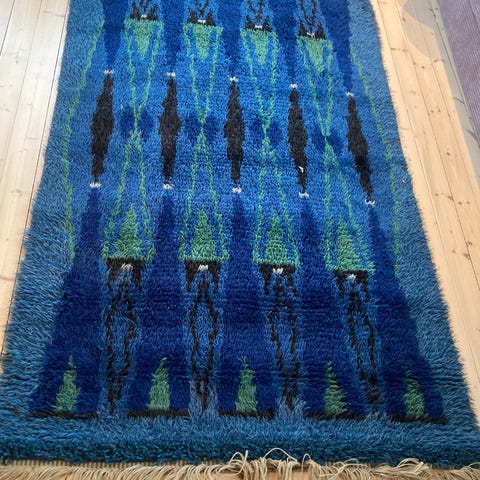Ca 205 cm langt, ca 210 cm inkl frynsene i kanten. Ca 136 cm bred. Hvit som hovedfarge med duse pasteller i bl.a lilla, rosa, blå, grønn. Frynser i endene. Ikke mye brukt, så framstår veldig fin.