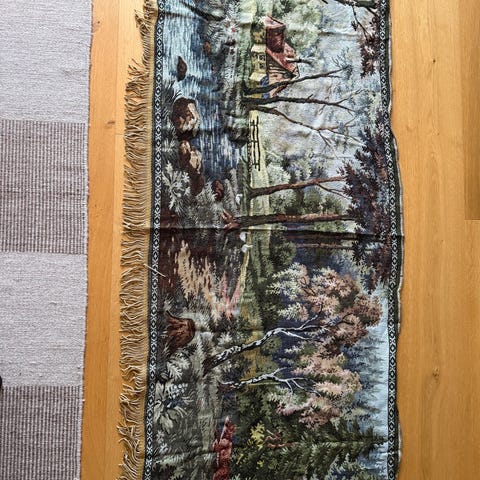 Størrelse 130 x 90 og 50 x 25 cm. Den minste biten er en del av den største, slik at stoffet kan utnyttes maksimalt.
