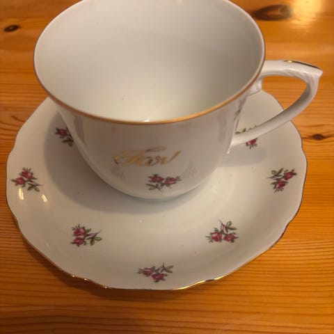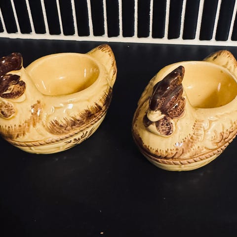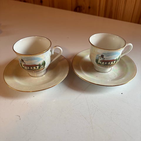To er med høner på. De er hvite og har gullkant oppe og nede. Det er en strek i stetten på det ene. Antagelig en liten sprekk.