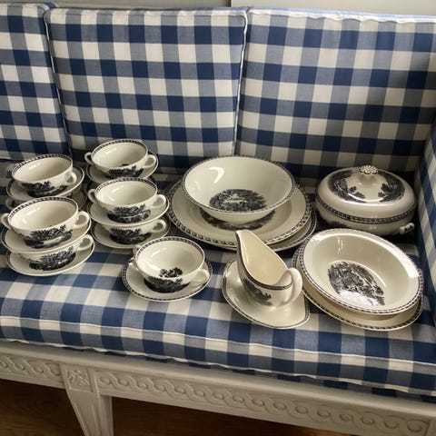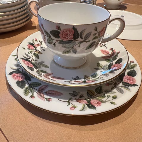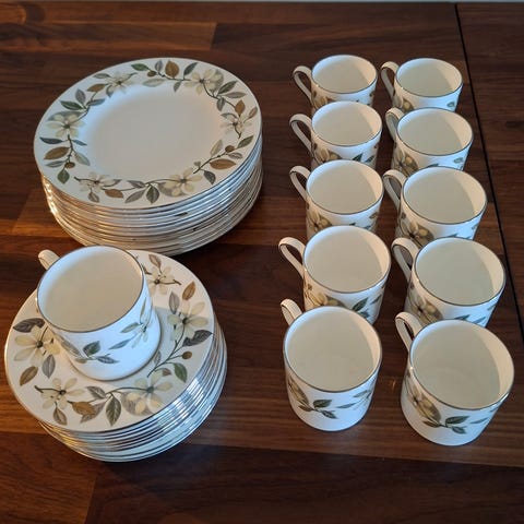 Royal Tuscan, made in England. Fine bone china. Member of the Wedgwood group. Kopp H: 6,5 cm D: 6 cm skål D: 12 cm og asjett D: 17 cm. Alle delene er i fin stand, ingen skår/skader. 11 sett, selges i triosett Kr. 250,- pr. sett. Fløtemugge og sukkerkopp med lokk, følger med på kjøpet ved kjøp av alle de elleve triosettene. Totalt 36 deler. Alle delene er i fin stand uten skader, med intakt gull og blank glasur. Selges evt. samlet kr. 2500,-