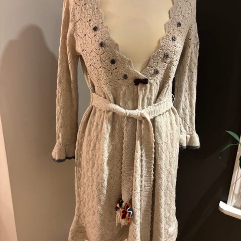 Unik kjole/tunika fra Odd Molly i myk lammeull strikket, heklet og brodert i en folklore stil. Mange fine detaljer. Lite og pent brukt. Str 1 (S/36).