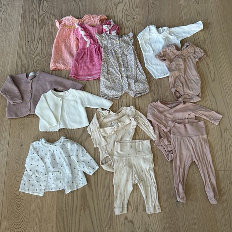 Selger et sett med babyklær til jente i størrelse 56. Hovedsakelig fra Zara, H&M og Newbie. Meget god stand. Anbefales på det varmeste.
