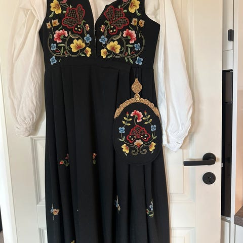 Har tidligere vært sydd litt inn, så noen av stingene rundt hoftepartiet er ikke helt perfekte, de synes ikke når man har forkle på, men det kan lett fikses hvis man ønsker det😁 Broderiet er veldig pent sydd!