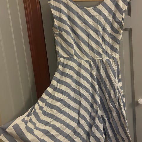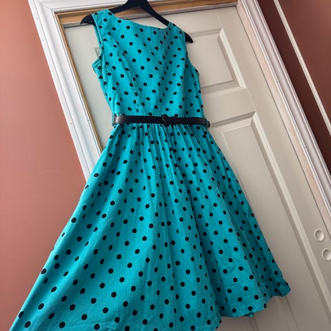 Kjole med polkadots i ulike farger. Pen fasong. Gøyale detaljer på skuldrene. Lite brukt. Str XL