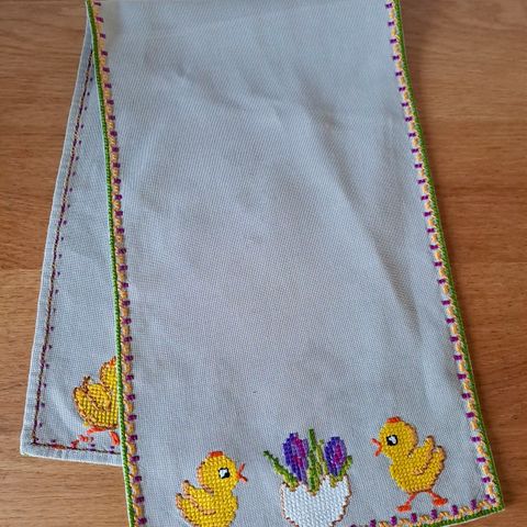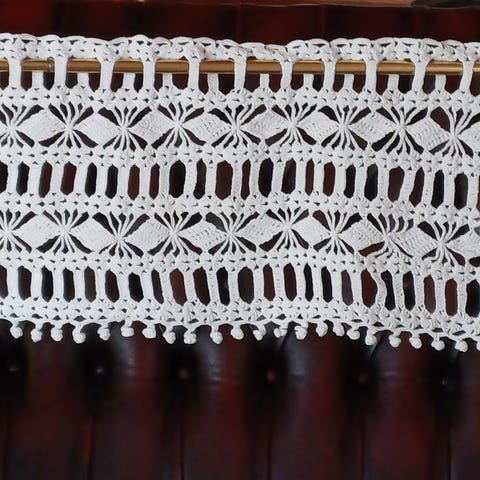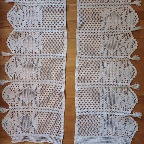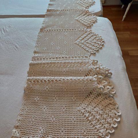 3 heklede lengder som kan brukes som gardinkapper eller løper.