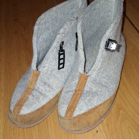 Varme og fine tovede tøfler ⁷ i ull med fast såle selges. Str står ikke, men sålen måler 25 cm på undersiden. Vil tro ca str 36.
