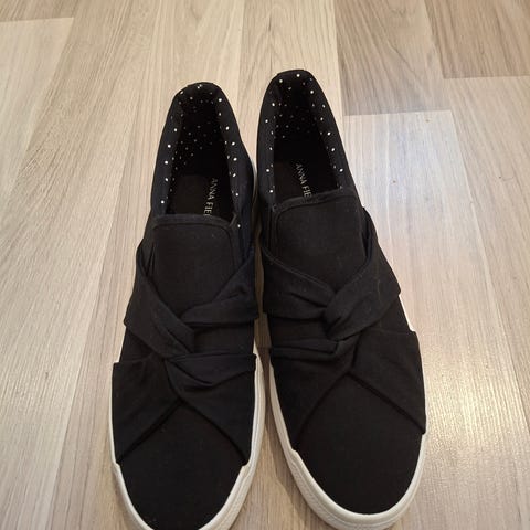 Selger sidde freshe skoene fra Aldo. De er i sort silkeaktig stoff med et bredt bånd over risten fylt av dekorative krystaller og rysjekant. Tilnærmet ubrukte (bruks ved maks 2 anledninger).