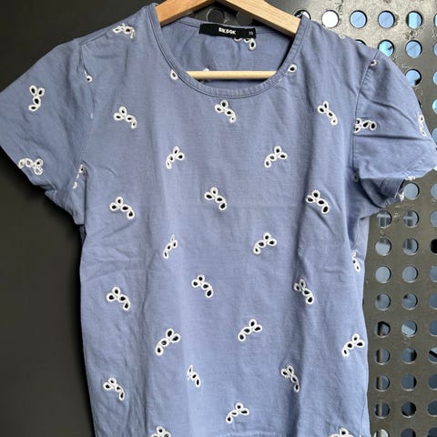 Selger en lang t-skjorte fra Bik Bok i størrelse XS. T-skjorten er stor i størrelsen og kan brukes av en XS–M avhengig av ønsket passform. Den har hvit bunnfarge med svart paisleymønster og striper, og teksten «New York» foran og tallet «26» på ryggen. Modellen er lang og kan også brukes som en kort kjole, avhengig av person. Selges ettersom den ikke blir brukt.