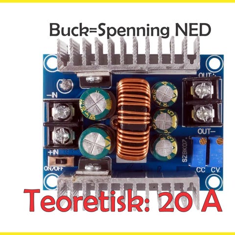 Utgangsspenning: 12 Volt til 60 Volt (justerbart) Maks utgangsstrøm: 20A (justerbart) Størrelse/mål: 130 mm x 84 mm x 52mm (se målfoto)