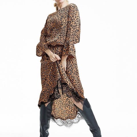Ny leopsrdkjole i str M selges for 200,-. Jeg mottok feil str - skulle hatt XL- så derfor salg. Ermer kan trekkes opp, sidelommer og fotsid/lang. Måler 110 cm omkrets bryst.