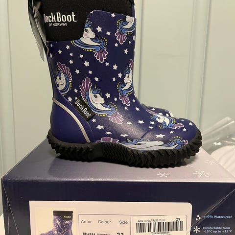 2 par Dock boot str 23. Et par mørke lilla og et par lyse lilla med Frost Elsa og Anna motiv. Nypris 600 kr per par.