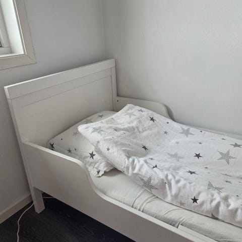Gråmalt barneseng/juniorseng i solid tre fra JLY. Sengen har stått røykefritt og dyrefritt hos bestemor, lite brukt og ser ut som ny.