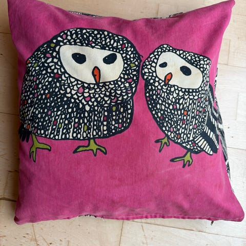 Pent brukt putetrekk med motiv av ugle foran, hvit bak. For puter 40 x 40, selve trekket er bittelitt lengre (lengde/bredde).
