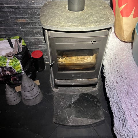 Design klassiker selges. Ferdig nedmontert. Matt sort med kleberstein i bunn og to sider. Glass i en side. Mulighet for åpen front eller fyre med gnist fanger i front. Unik stemningsskapende på grunn av kontakt med «bålet» lyd og varme messing. Gir ikke alt for mye varme slik at den kan benyttes i godt isolerte bygg eller utestue, gapahuk , orangerie etc …250 mm røykrør. Glassplate for gulv kan medfølge for 500 NOK